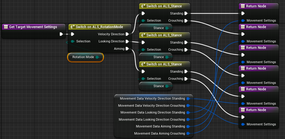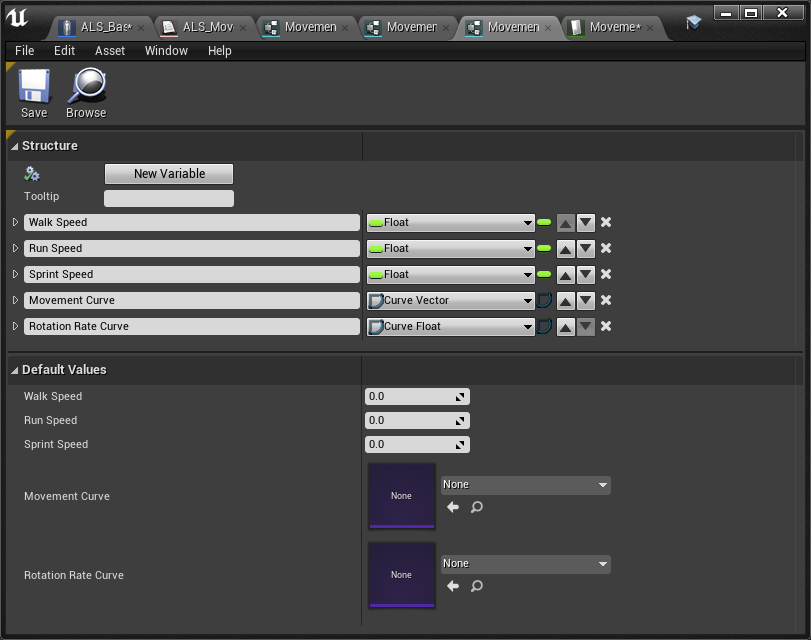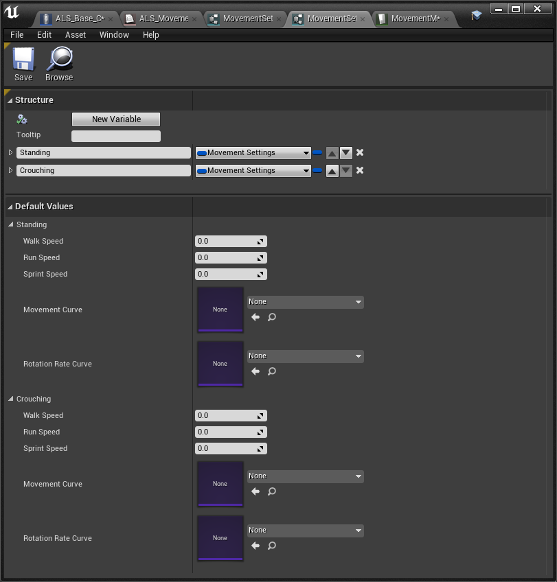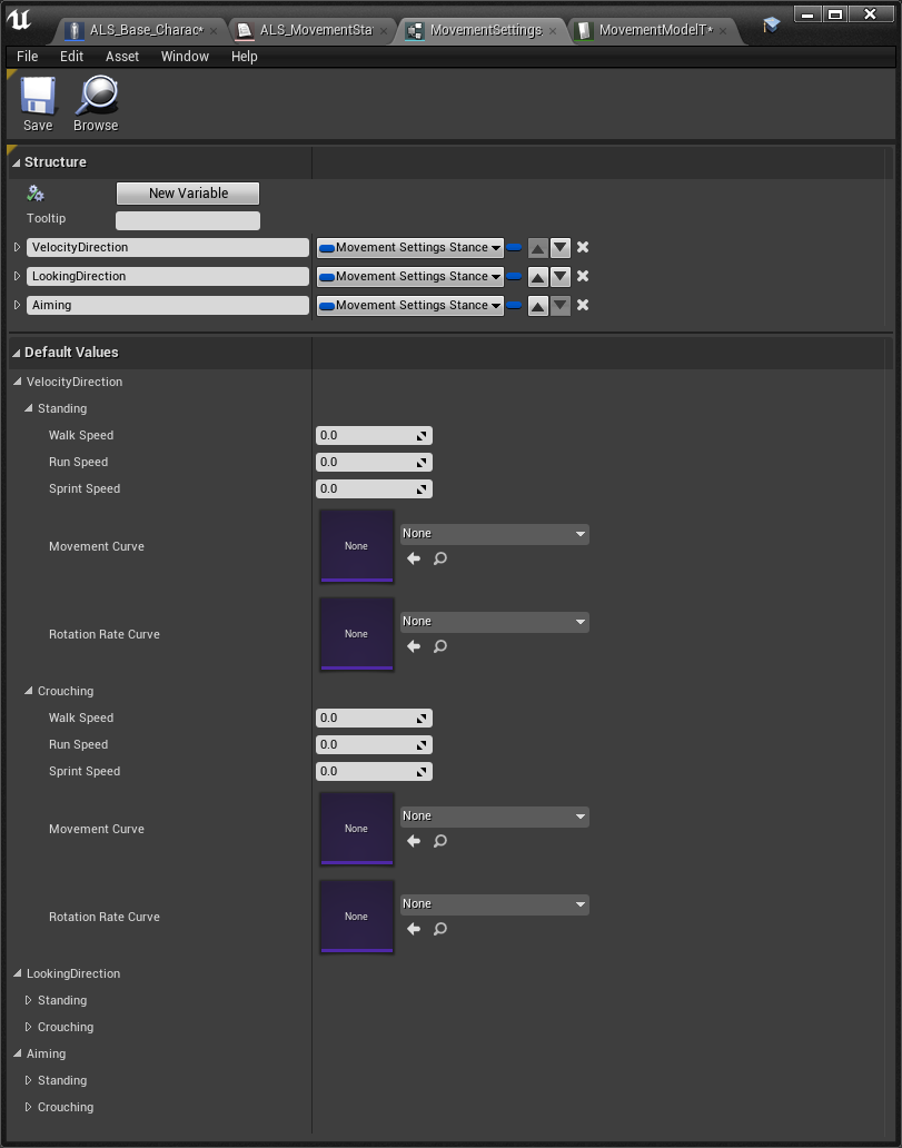 Movement Settings > MovementSettings_Stance > MovementSettings_State 순서로 상속 받으며 커짐.