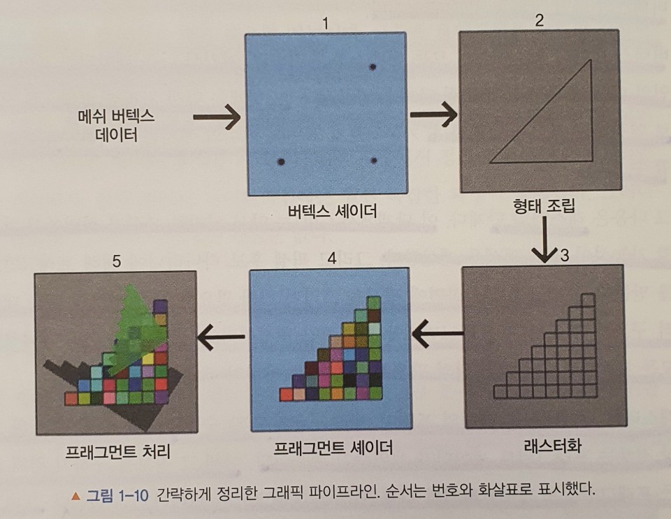 - 메쉬를 화면의 이미지로 만들기 위해 그래픽 카드(GPU)가 처리하는 일련의 과정